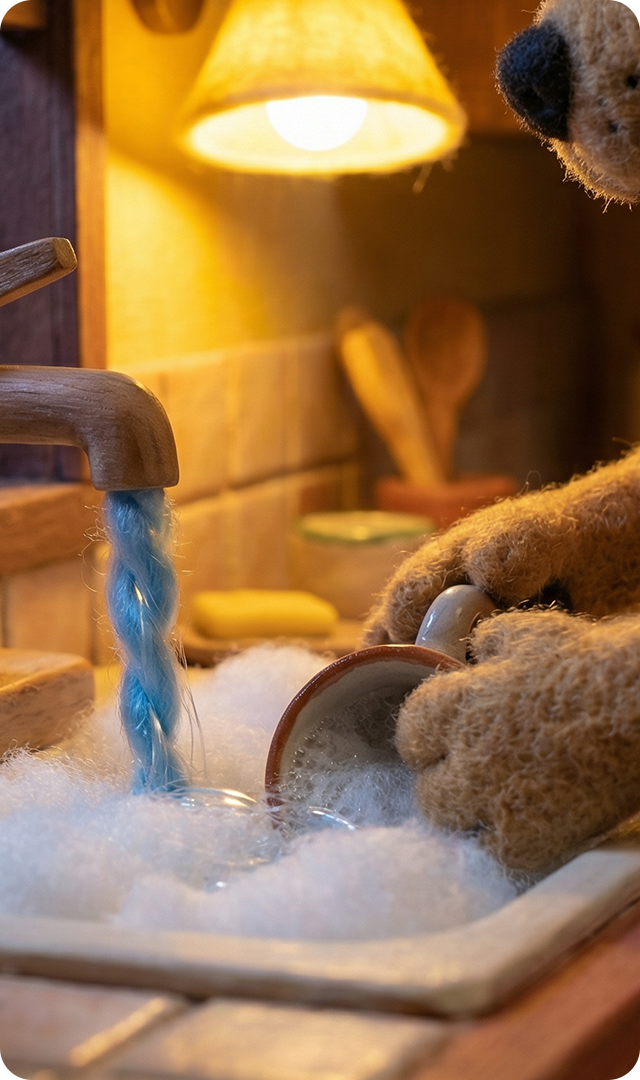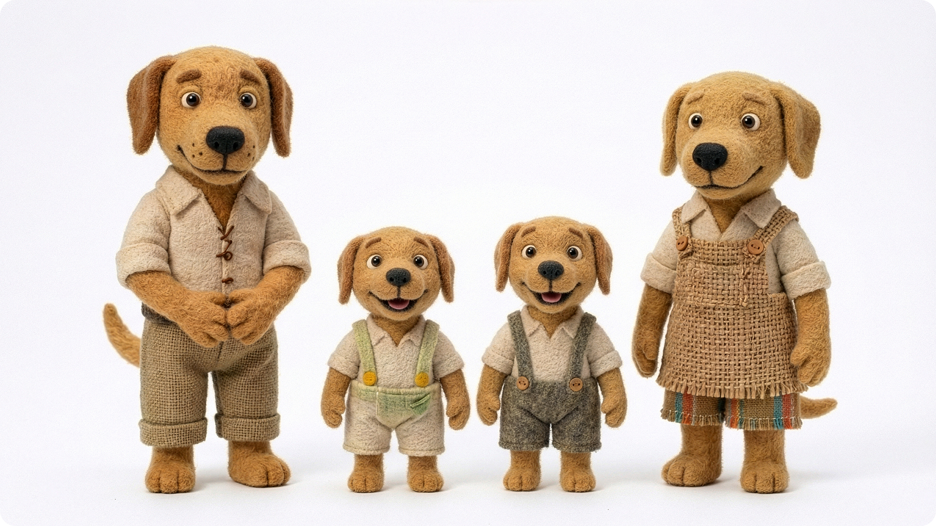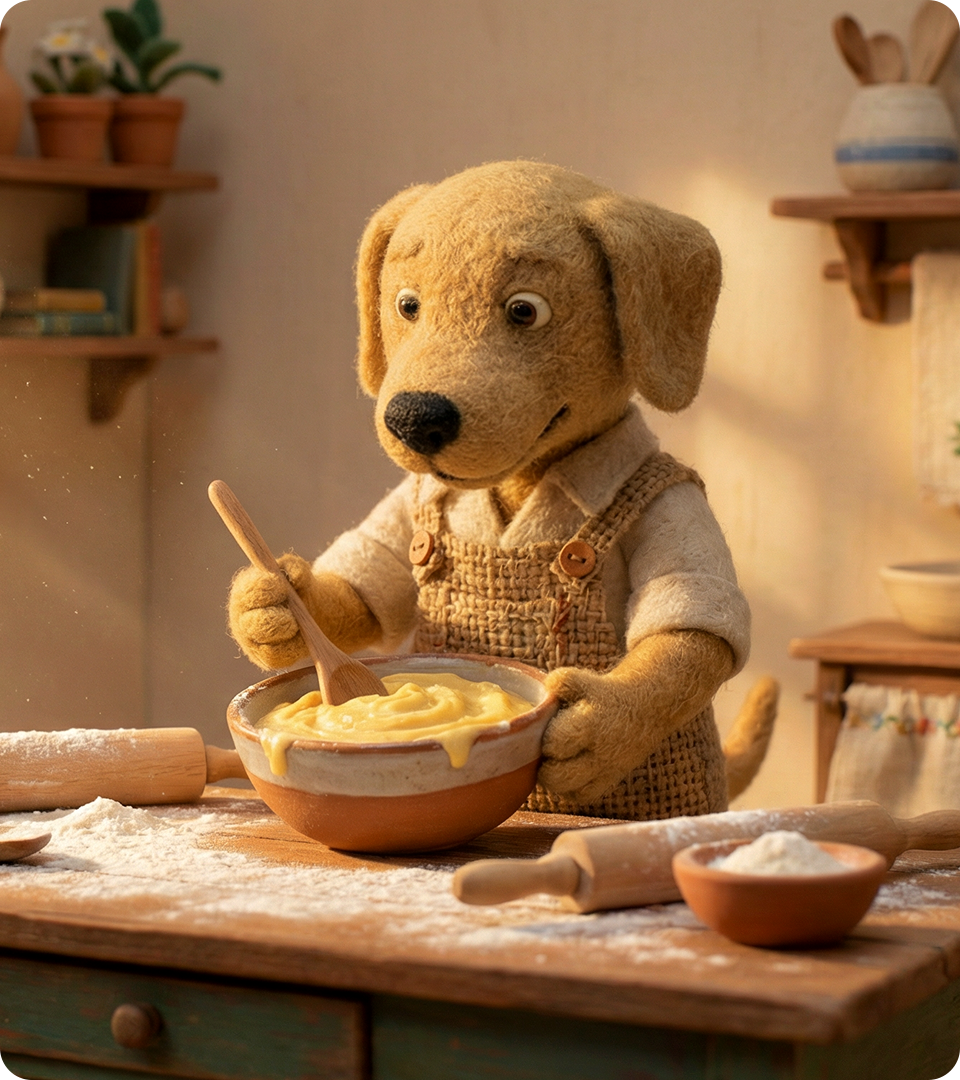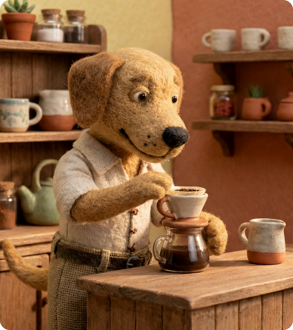 A ideia começou pelo desenvolvimento do ambiente e da casa, e esses personagens nasceram como parte natural desse processo. Eles não existem para conduzir a história, mas para habitar o espaço. Cada cachorrinho representa um ritmo do cotidiano: a curiosidade calma, o cuidado silencioso, a presença atenta. Suas formas, roupas e expressões foram pensadas para transmitir afeto, simplicidade e familiaridade, como se sempre tivessem pertencido àquele lugar. Estão ali para acompanhar o tempo passar, participar de pequenas ações do dia a dia e reforçar a sensação de lar. Personagens que não pedem atenção, mas convidam à permanência.